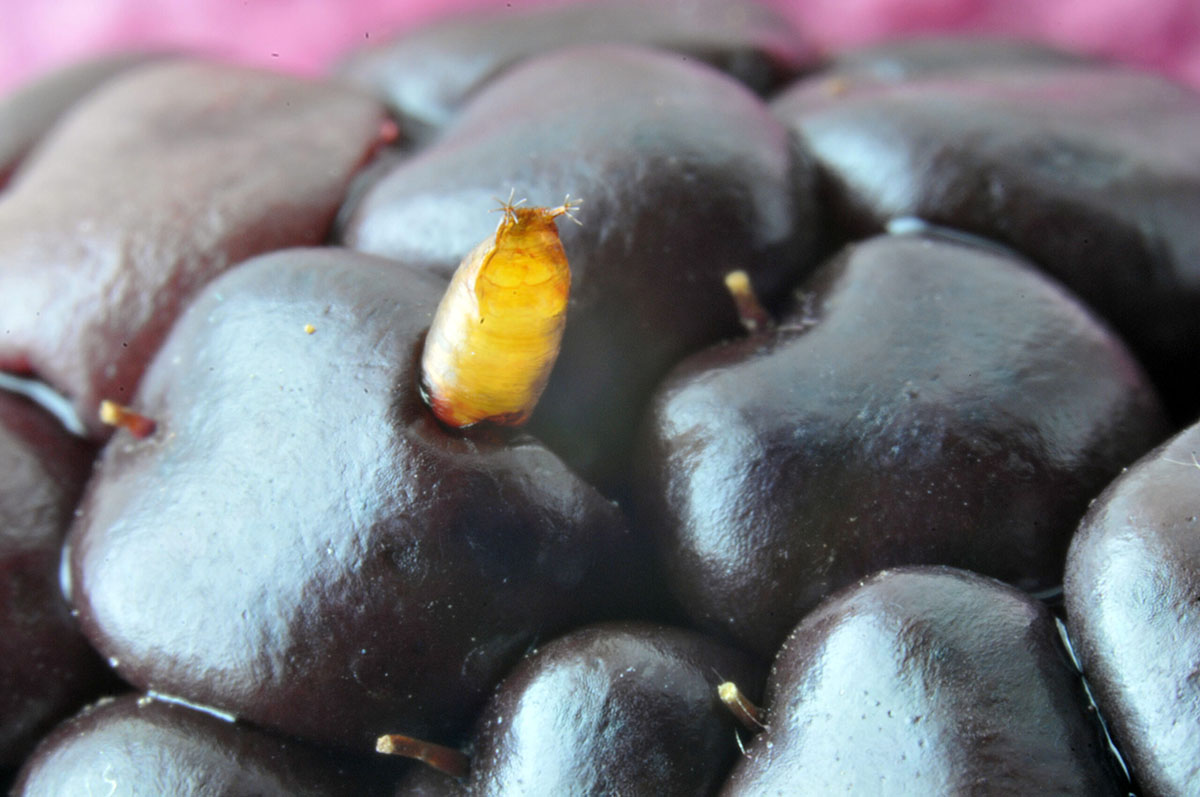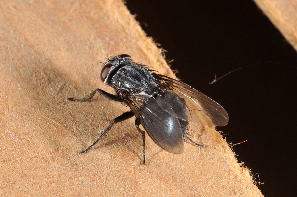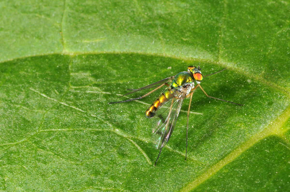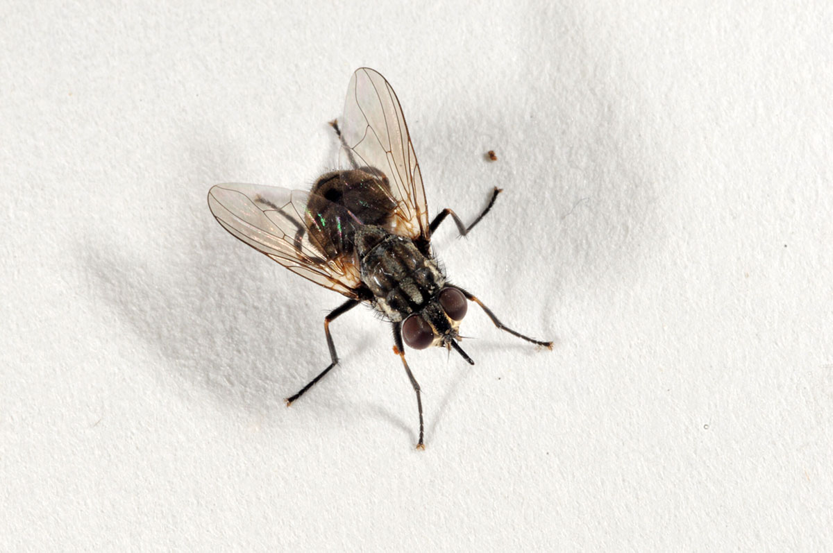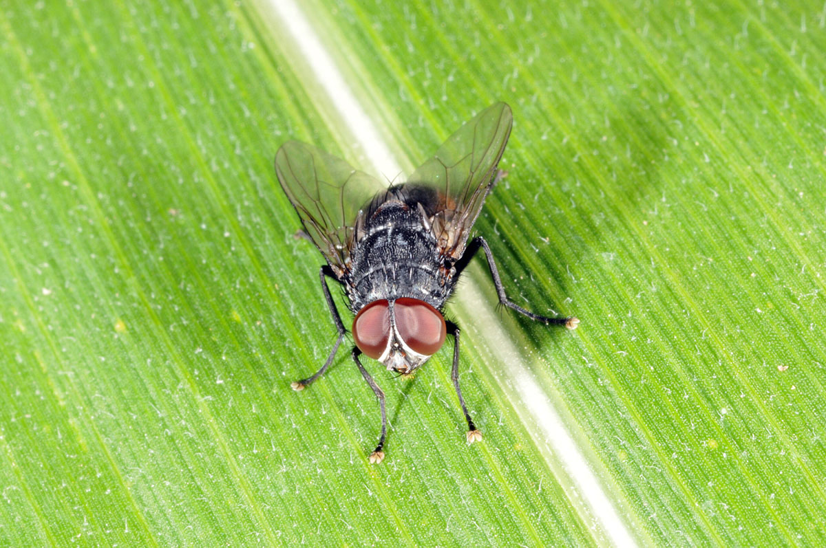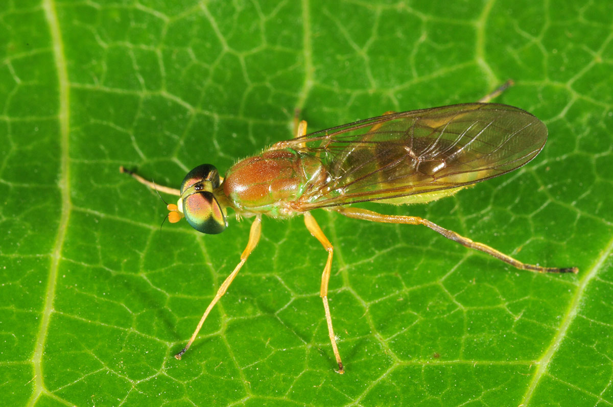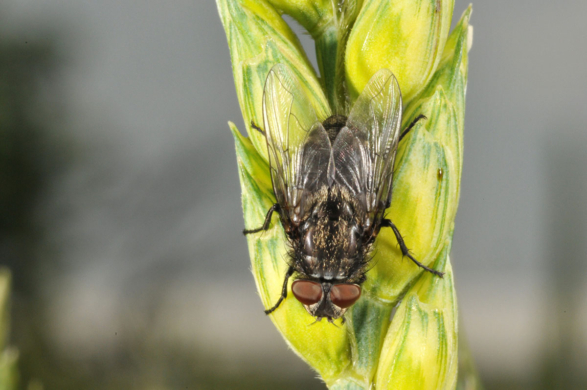 Spotted wing drosophila male fly on blackberry (dorsal view)