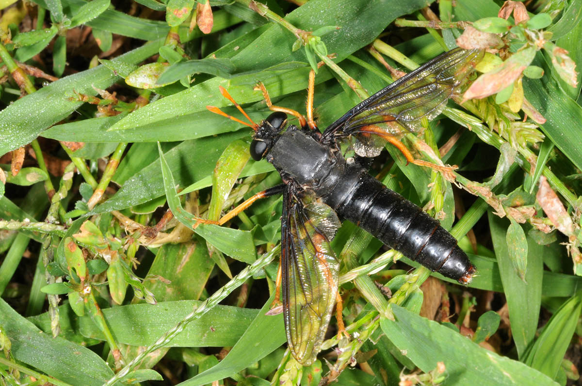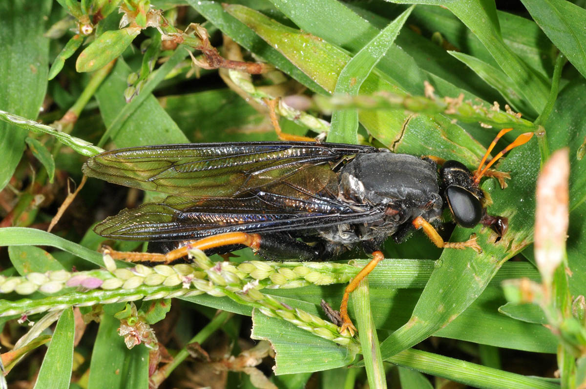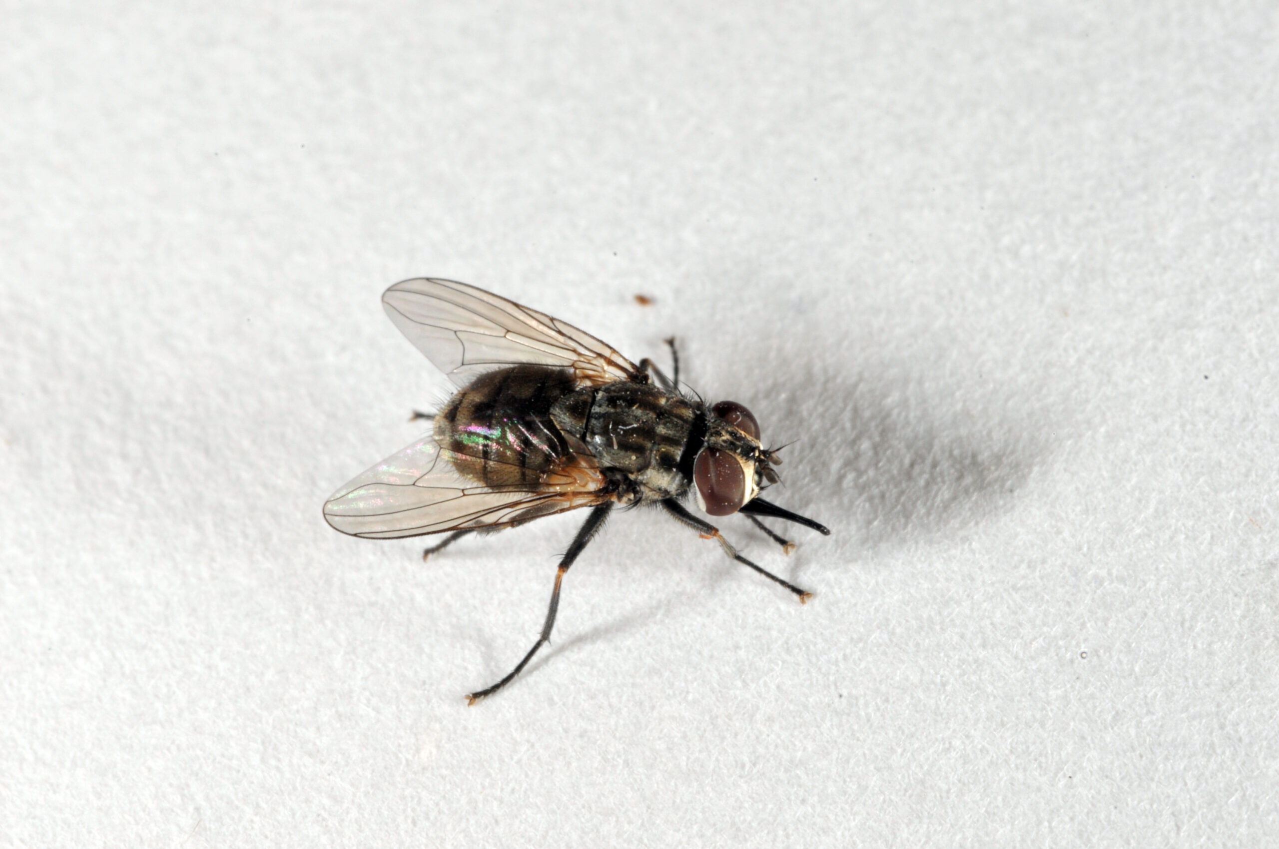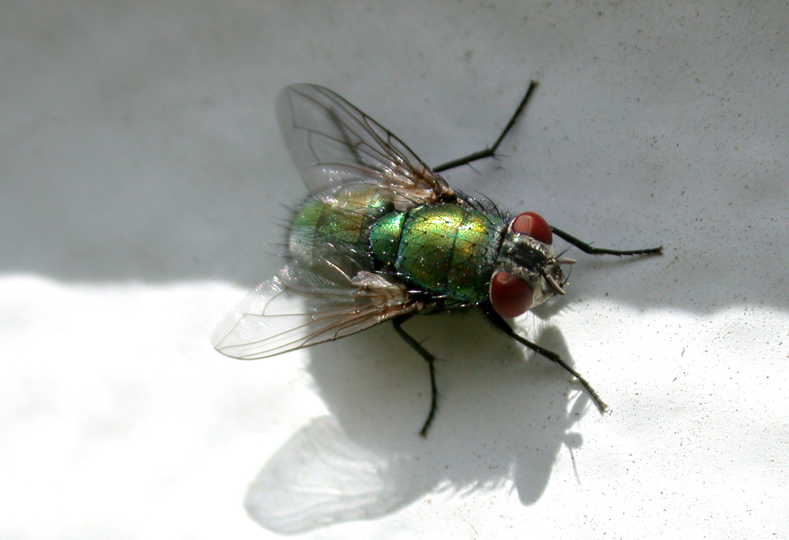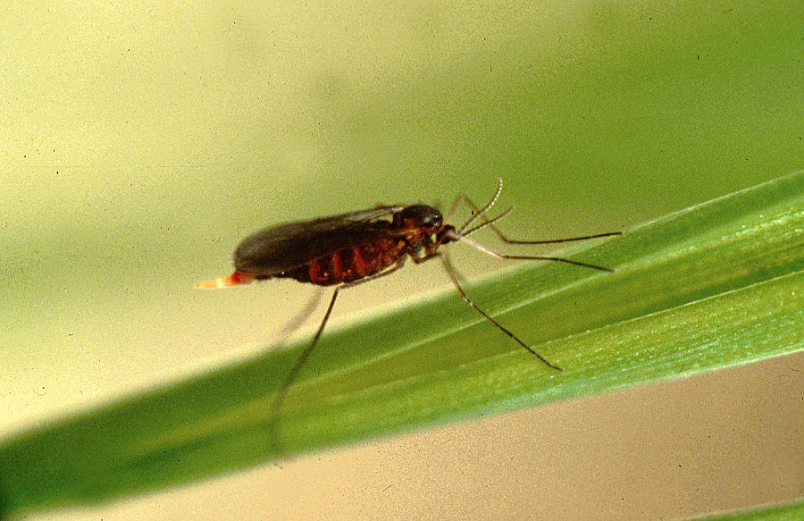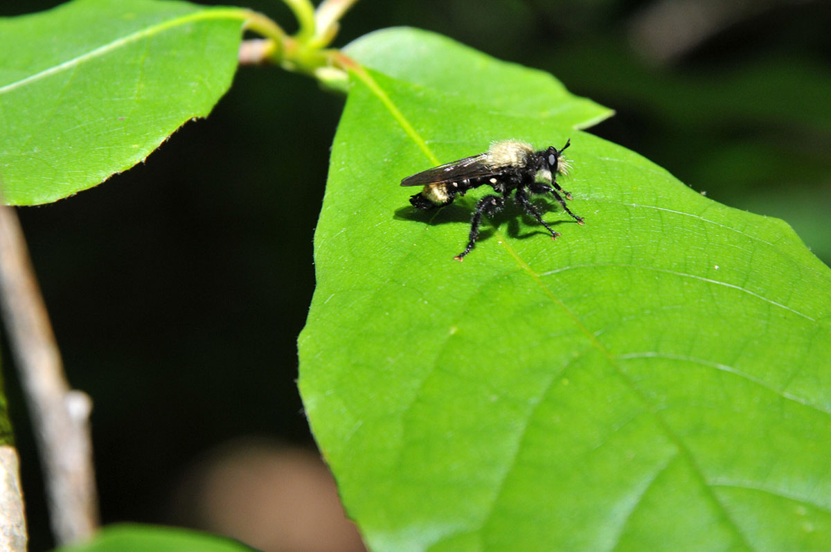 Spotted wing drosophila male fly on blackberry (dorsal view)