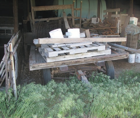 If we load a wagon with 90 straw bales averaging 38.6 pounds each, then the loaded wagon would carry 3,474 pounds. The front wagon has a gross empty weight of 1,890 pounds and the rear wagon has a gross empty weight of 1,820 pounds. Thus, the front wagon has total weight of 5,364 pounds and the rear wagon weighs 5,295 pounds.