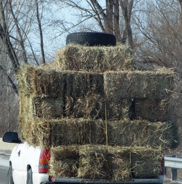 What are people thinking when they load hay in this manner? Round bales want to roll backward. One quick turn around a corner, and these bales can easily slide off onto the roadway.