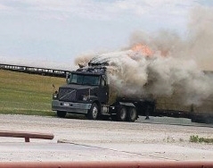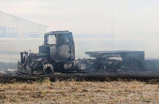 “The fire quickly engulfed the entire load. I didn’t make it much further when the heat and increased wheel burden blew two more tires. I could barely move with one tire to even get it off the road. I then decided I had to save the truck. Flames were almost melting the back of the truck. Of course, the hitch pin was bent, nearly impossible to unhook with it loaded down. I had to crawl under the truck to escape the flames to beat the pin out. I saved the truck but then had a field fire. Someone passing by earlier must have called the fire department.