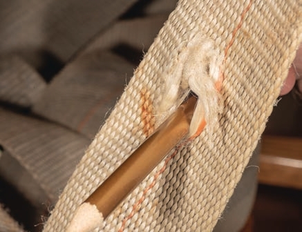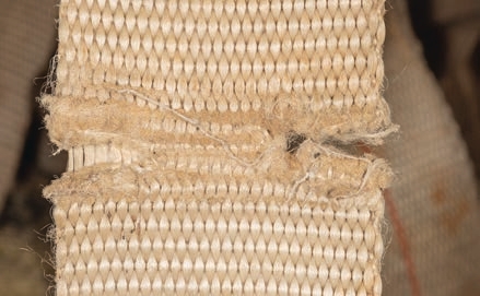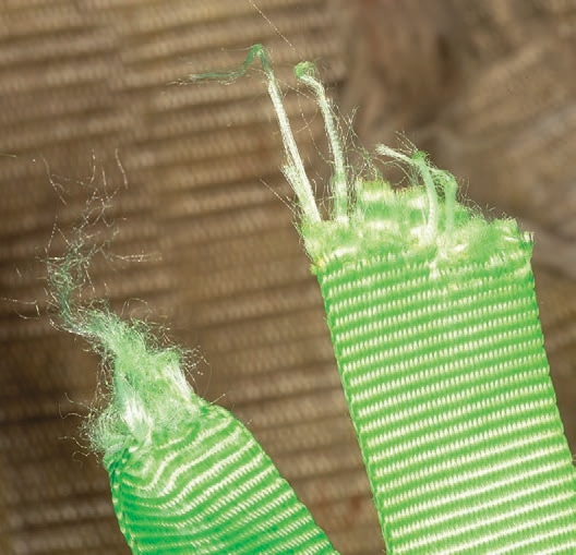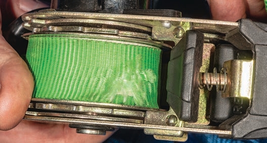 Using cut and damaged straps defeats all the work you took to create a tight load on the trailer. The straps you see in the following two photos are close to failing. If an accident occurred while using defective straps like these, the operator would be cited for clear evidence of negligence. Straps are a cheap investment compared to the potential expenses of a court case or product loss.