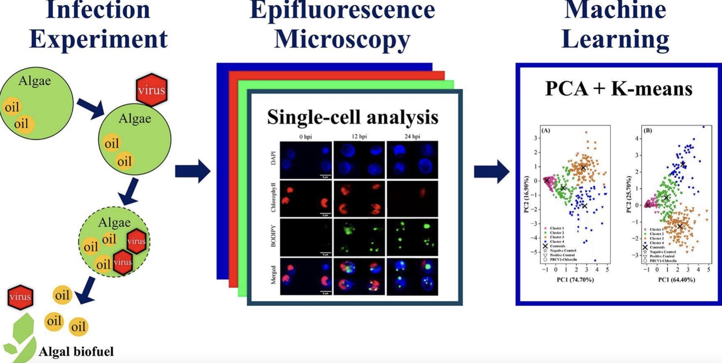 Algae are promising renewable energy sources for biofuel production but remain cost-bottlenecked by lipid extraction. A low-energy solution could be provided by viral lysis by PBCV-1, a Chlorella-specific lytic virus that occurs widely in the natural environment. PBCV-1 can lyse host cells and release the intracellular lipids without using expensive sonication or chemicals. Although its capacity for disruption is documented, limited information is available on how it might rewire the host’s lipidome before lysis. The objective of this study was to investigate triacylglycerol (TAG) accumulation profiles in Chlorella infected with PBCV-1. A high-resolution epifluorescence microscopy approach was employed to analyze over 4,000 cells across a full PBCV-1 lytic cycle to monitor TAG accumulation, chlorophyll fluorescence, and nuclear morphology. A multivariate unsupervised machine learning analysis revealed infection-driven asynchronous phenotypic trajectories with a 165.2 % relative increase in TAG fluorescence, contrasting with a negligible lipid gain of 5.1 % in uninfected cells. This virus-induced lipid enrichment approach has generated TAGs at levels typically achieved through nutrient deprivation, salt stress, or other synthetic or cultivation stress induction techniques. Extracellular nitrate and phosphate were further analyzed with ion chromatography under nutrient-replete conditions (NO3–-N > 50 mg L-1, PO43--P > 65 mg L-1) to exclude the confounding factors of nutrient stress on lipid accumulation. The results demonstrated that PBCV-1 is a metabolic modulator and enhances TAG reserves intracellularly before facilitating their release. This study provides a novel biomimetic approach to accumulate and extract algal lipids for cost-effective biofuel production. Read more HERE!