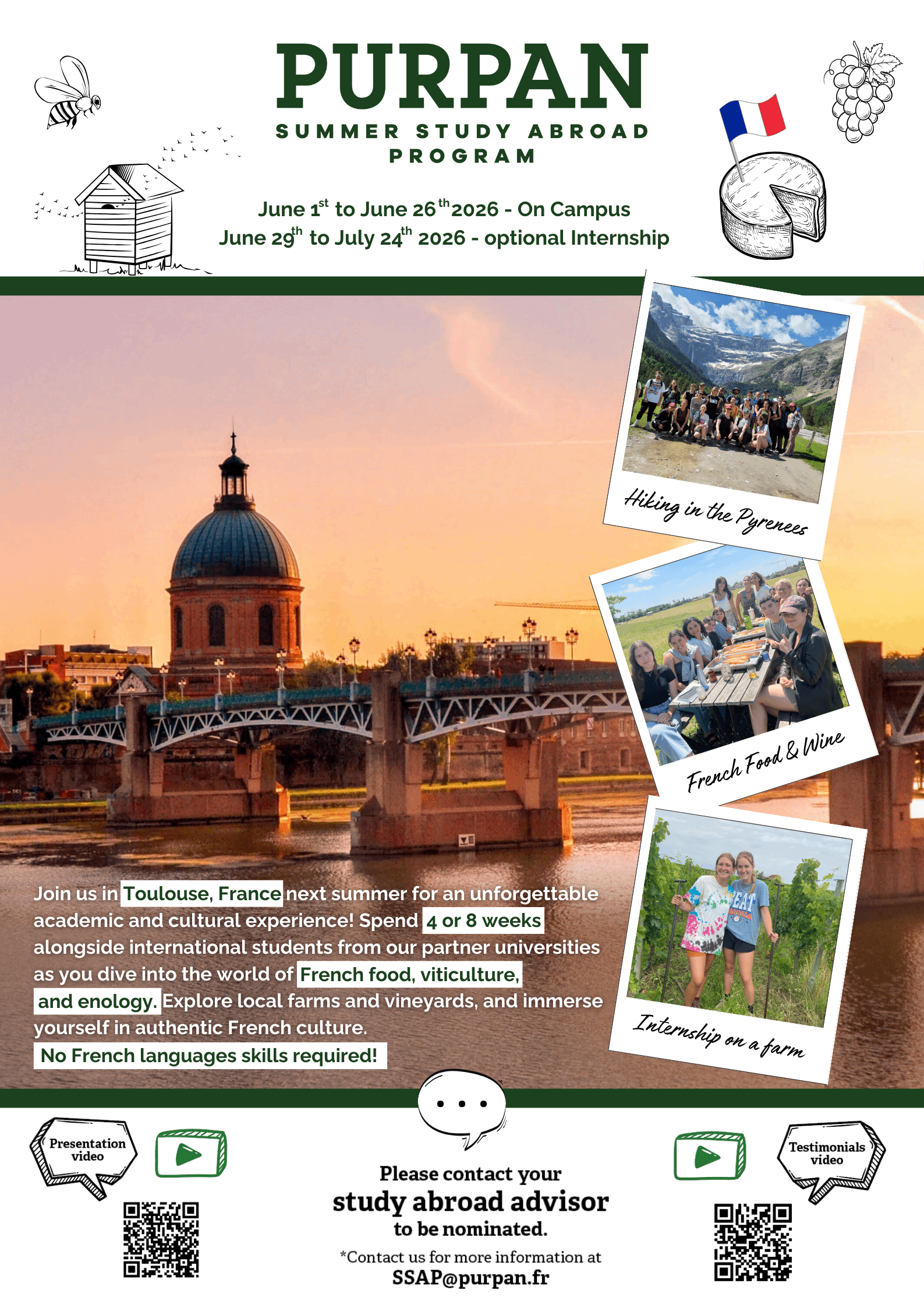 This 8 week program is at the Ecole d’Ingenieurs de Purpan in Toulouse for 6 credits. At Purpan students will learn about French agriculture, culture and language. During the weekends, students will visit the Pyrenees mountains, Bordeaux and have a free weekend. No prior knowledge of the French language is required. Several other universities participate in this program as well. The second month students will participate in a farm experience/unpaid internship. The cost of the program is Summer Tuition, $64 for insurance, estimated Purpan program fee of $3000, airfare (estimated at $1500), some meals, and $165 for a passport.ECOLE D'INGENIEURS DE PURPAN