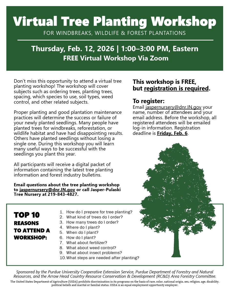 This workshop is FREE but registration is required, use the sign-up link. This workshop is FREE but registration is required. Email jaspernursery@dnr.IN.gov your name, number of attendees and your email address. Before the workshop, all registered attendees will be emailed log-in information. Register by Friday, Feb 6th.