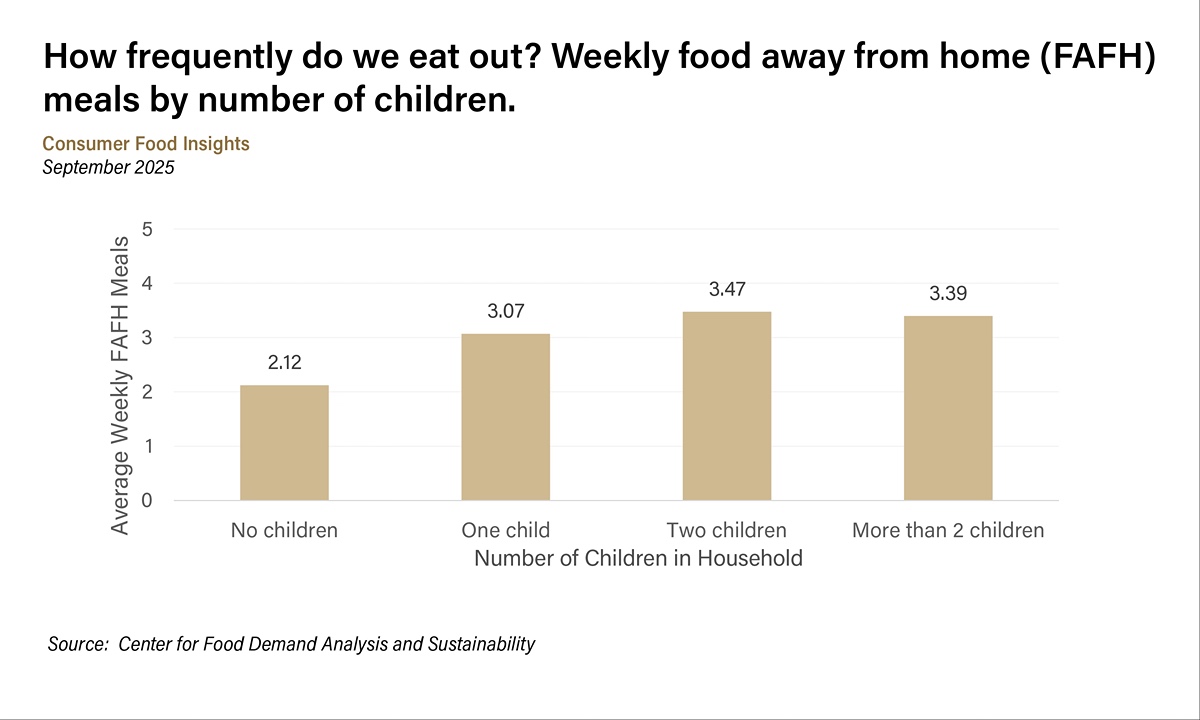 Households with children report eating out nearly one meal more per week than those without, though this trend tapers as family size increases. “Convenience plays a key role in food-away-from-home spending for families, with takeout and delivery making up a larger share of their budgets,” Bryant said. “In contrast, child-free households split their spending more evenly between dine-in and quick-service options.”