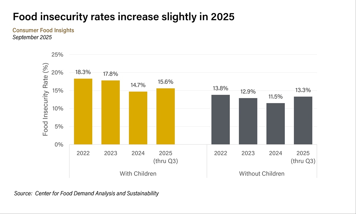 National food insecurity stands at 13% as of September, showing a slight improvement from August, according to recent survey data. However, households with children continue to face higher rates of food insecurity — 15.6% compared to 13.3% for those without children thus far in 2025.