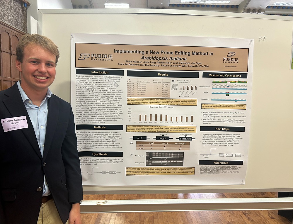 Wagner works in the Ogas Lab as an undergraduate researcher. He has learned techniques for studying chromatin remodeling in Arabidopsis, a model plant used in genetic research. His first project involved prime editing, a precise gene-editing method that helps scientists make small DNA changes with fewer errors.