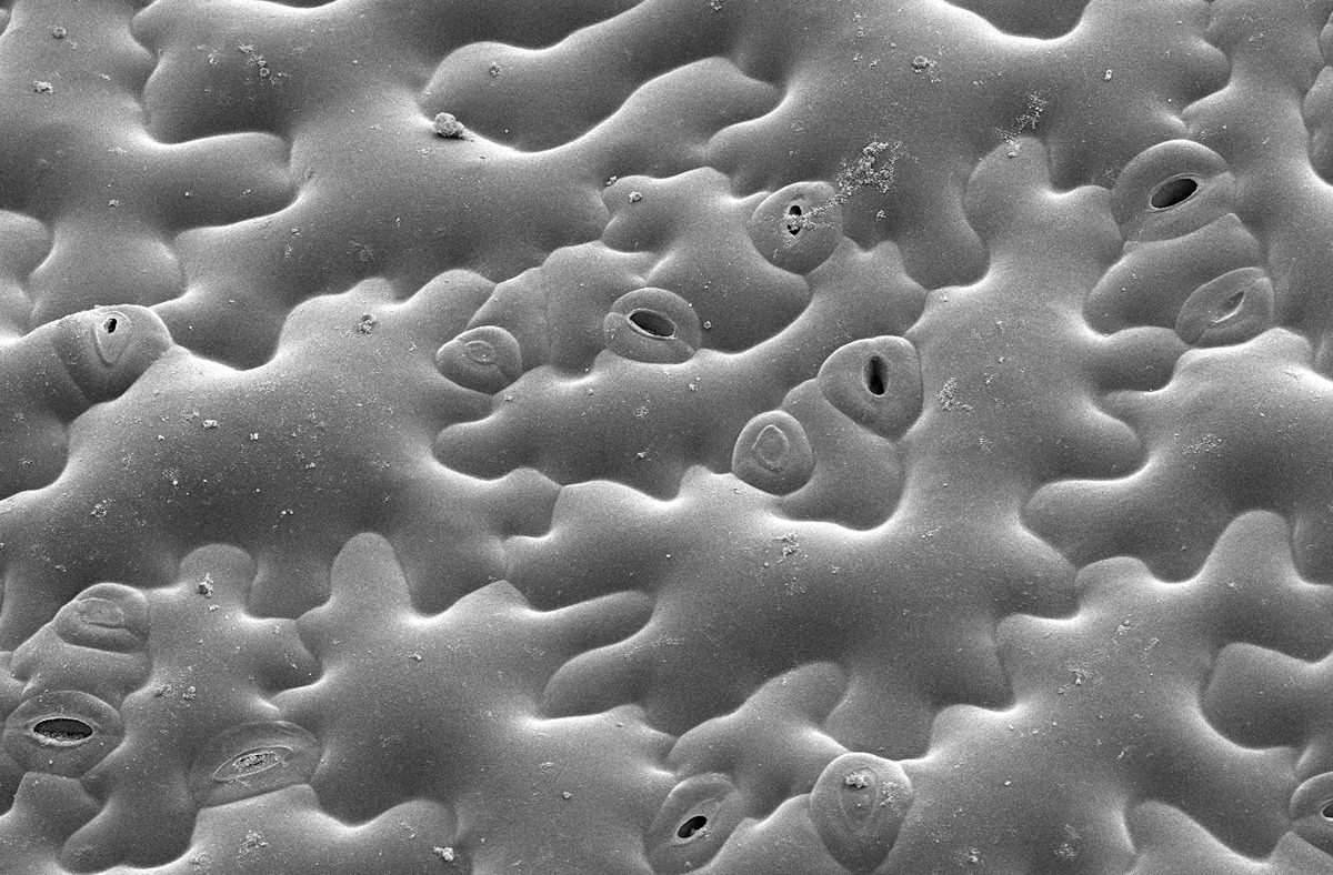The outermost layers of cells in a leaf, called the epidermis, exert strong controls over the leaf to determine its patterns of growth. In leaves, it forms a functional, complex network of jigsaw puzzle piece-shaped cells that cooperate as a unit to define growth behaviors of specific cells and of the leaf as a whole. (Photo provided by the Szymanski lab.) Plant cells are “glued” to each other, yet they are constantly growing. The high internal pressures of plant cells generate strong and multi-directional forces in the cell walls to drive growth. A cell senses stress, and it adapts the wall composition to better support the leaf and stay connected to the rest of the epidermis. If this cell to cell adhesion fails, the entire developmental system falls apart, the plant loses water and dies.